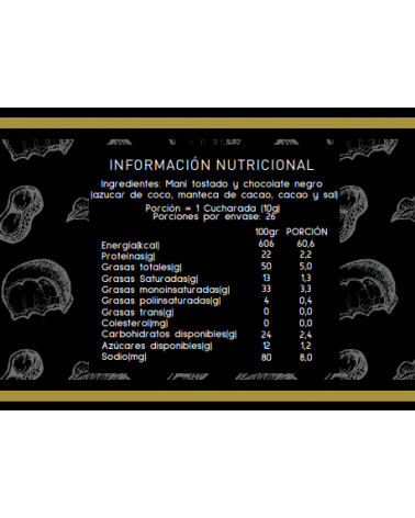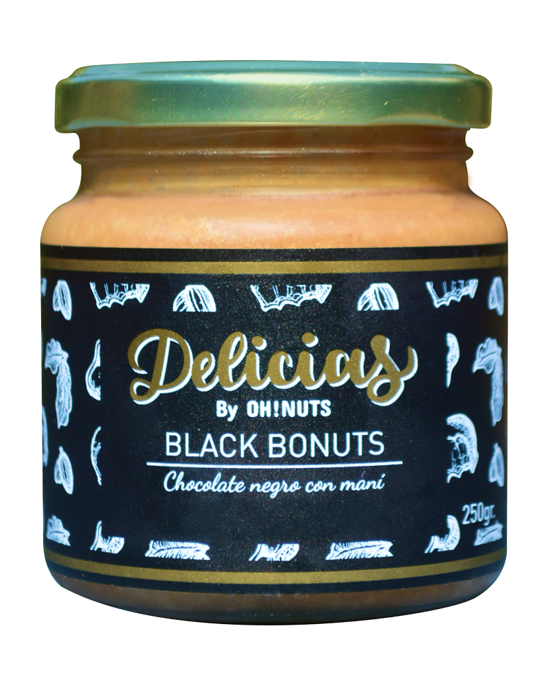 Delicias By OH! NUTS Black Bonuts, maní tostado + chocolate negro vegan, endulzado 100% con azúcar de coco.